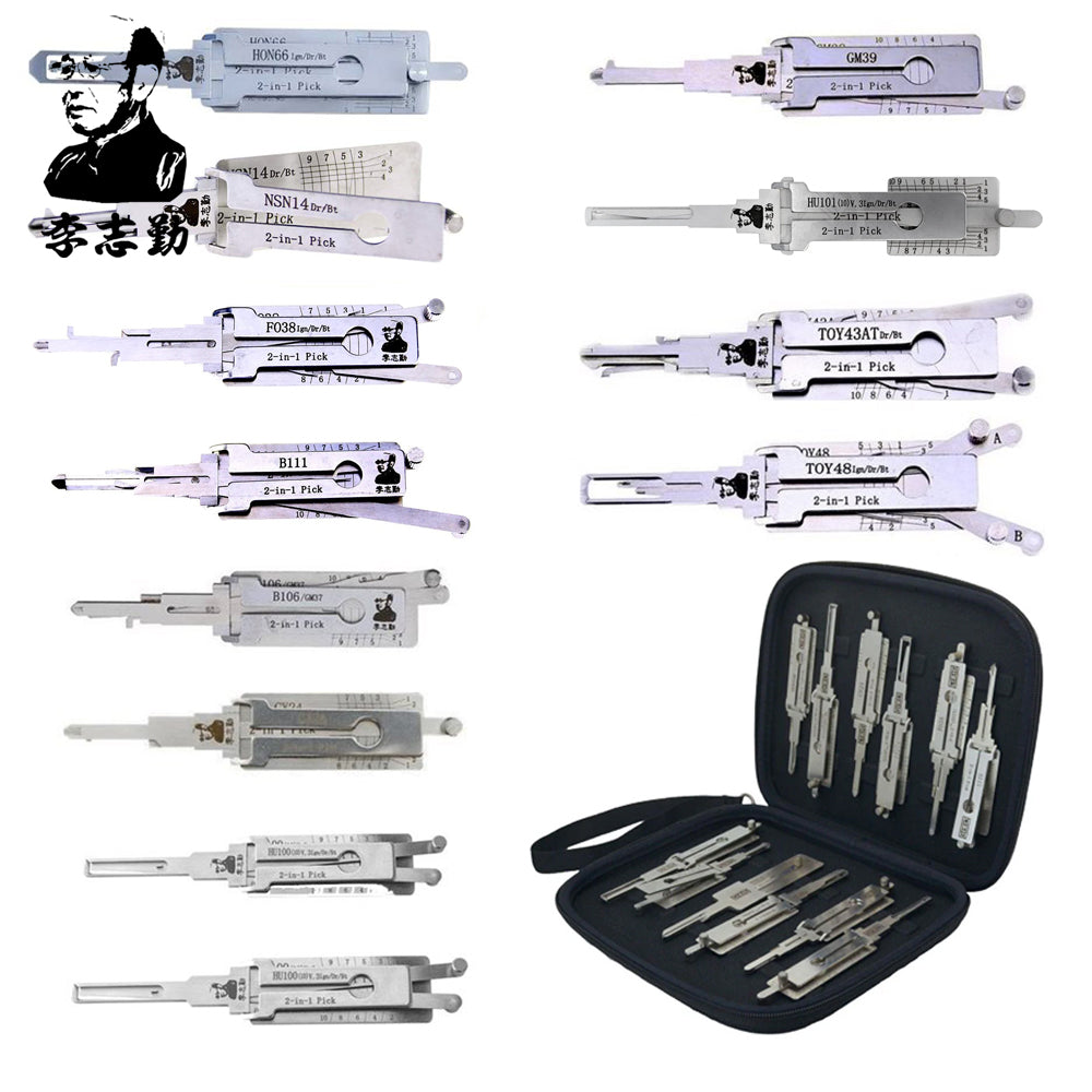 The bundle consists of 12 different automotive Lishi tools designed for a wide range of popular vehicle models. This groundbreaking tool for locksmiths, crafted by Mr. Li, enables you to pick and decode an automotive keyway simultaneously, unlocking a vehicle while also gathering the necessary information to create a new key. Complete with a high-quality carrying case, this bundle is the ideal way to experience the exceptional efficiency of original Lishi Tools!